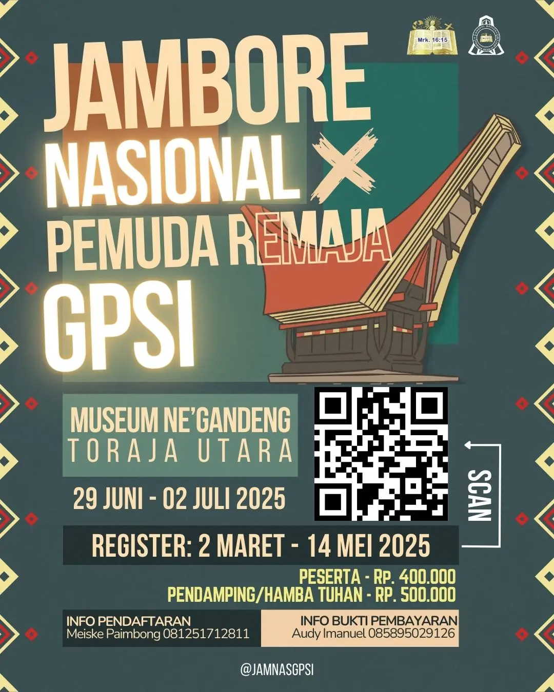 Bergabunglah dalam Jambore Nasional X Pemuda Remaja GPSI yang akan diadakan di Museum Ne’Gandeng, Toraja Utara, pada 29 Juni – 2 Juli 2025. Daftarkan diri Anda mulai 2 Maret – 14 Mei 2025